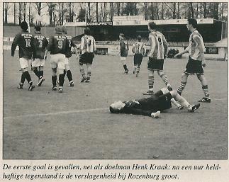 De eerste goal is gevallen, net als doelman Henk Kraak: na een uur heldhaftige tegenstand is de verslagenheid bij Rozenburg groot.