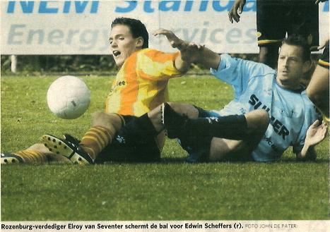 Rozenburg-verdediger Elroy van Seventer schermt de bal voor Edwin Scheffers (r)